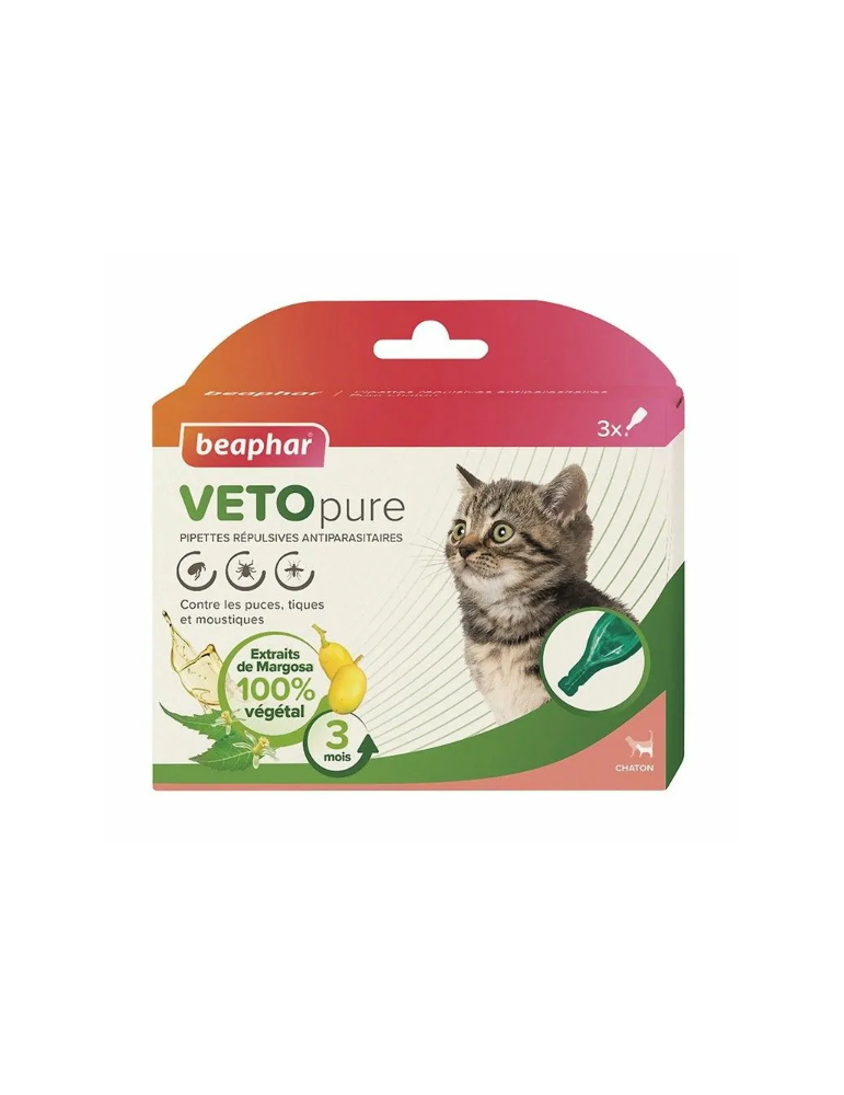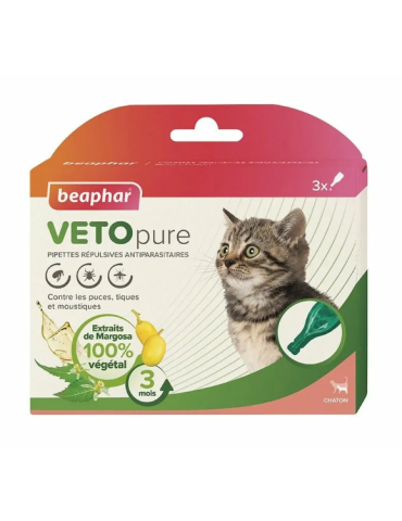 Les pipettes Vétopure 0,4 ml offrent une protection naturelle contre les puces, tiques et moustiques pour les chatons. Chaque pipette permet un mois de traitement, soit 3 mois de protection avec le pack complet.