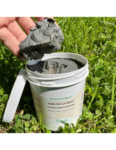Ce cataplasme d’argile naturel Nutragile est une pâte prête à l’emploi composée d’argile bentonite de qualité cosmétique, d’eau structurée, d’huile de cade pure et de jus d’aloe vera.