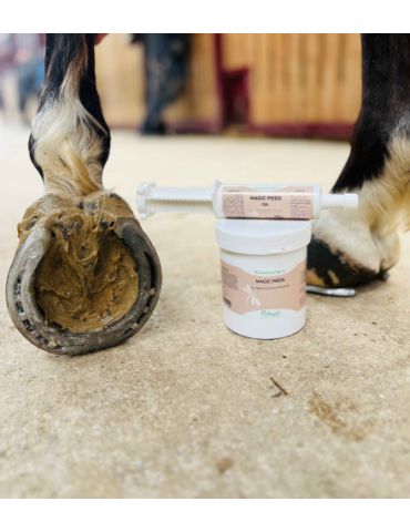 Magic Pieds est une pâte naturelle prête à l’emploi spécialement conçue pour soulager les douleurs des pieds du cheval.