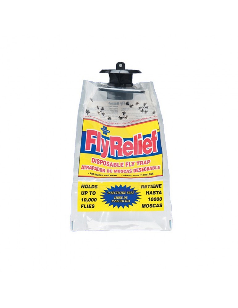 Fly relief est un piège a mouches jetable sous la forme d’un sac à suspendre dans les écuries.