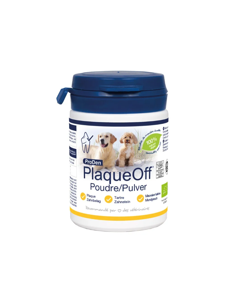 PlaqueOff Poudre est un soin dentaire en poudre pour chien et chat qui permet de régler les problèmes de mauvaise haleine